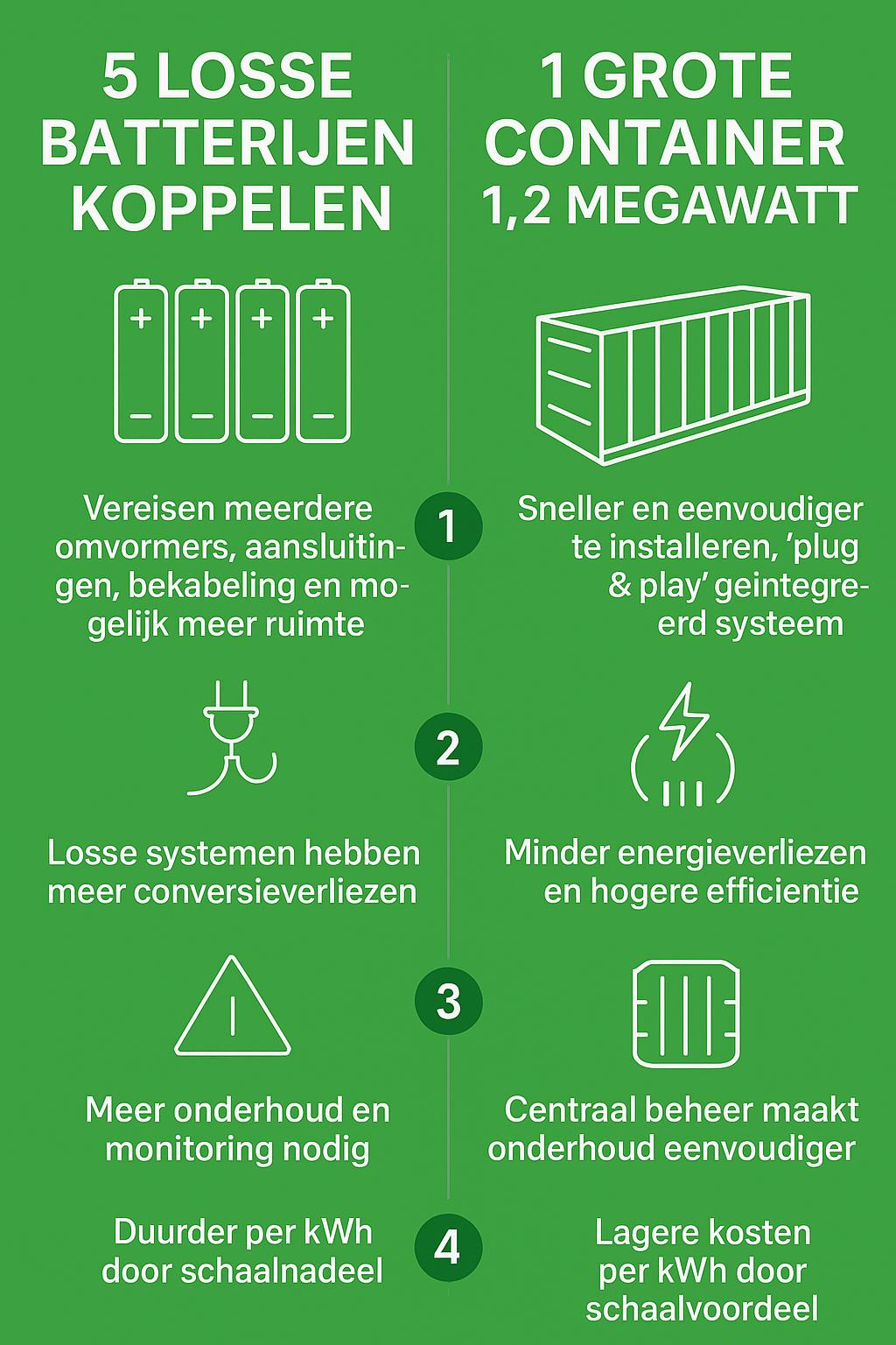 Für kleinere oder schrittweise wachsende Installationen sind gekoppelte Batterien ideal. Wenn Sie jedoch wissen, dass Sie sofort (oder in naher Zukunft) viel Speicherkapazität benötigen, ist ein Container meist die klügere Wahl.